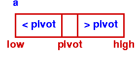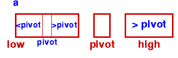 (equal to pivot)Another one described in textbooks algorithms of partitioning is shorter, does not require additional test checking if left exceeds the array bound. In case of random data it slightly more efficient, But, unfortunately, it is more difficult to understand. The idea is that if pivot at the end occupies the position S then exactly S-1 items should be less or equal then pivot. So partitioning can be done by exchanging each found element that it less or equal then pivot with 1,2,3,...S-1 elements of the array correspondingly. Final order of elements here will be different then in previous partitioning algorithm and some elements can be swapped two or more time. In case of identical elements this algorithms does a lot of unnecessary work so in some cases it is less efficient them previous.