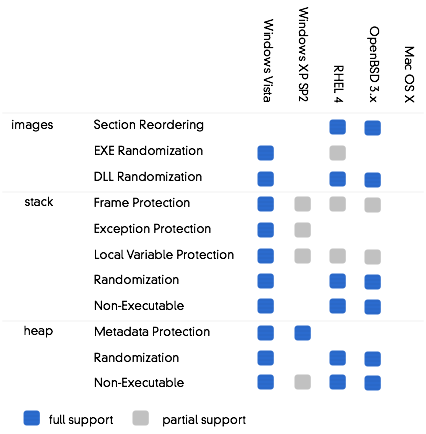 Actually diagram looks more like a wishful thinking then actual depiction of the state of the art. I am very skeptical that RHEL ever can match OpenBSD in this area. Also it is new to me that RHEL 4 has default hardware stack overflow protection enabled in non AS-level kernels. I think that this is a typo and actual version should be 5 as capabilities listed on the diagram below mostly belong to RHEL 5. Even in this version most are still experimental (SELinux restricts certain memory protection operation only if the appropriate Boolean values enable these checks; those options are rarely used and if used might not work in RHEL 4. For more information see [PDF] Security Enhancements in Red Hat Enterprise Linux (beside SELinux), LWN Security-improving technologies which could be deployed now , LWN Edgy and Proactive Security and danwalsh SELinux Reveals Bugs in other code.;