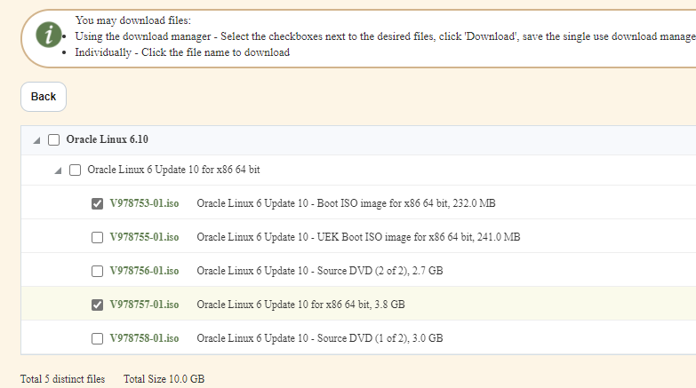 It is not that easy to find where images are stored on Oracle site. One useful link is Search Software (oracle.com). After you see the product you want, in this example Oracl Linux 6.10 you click on the collection icon and get a set of ISO files from which you need to select those that you want:
