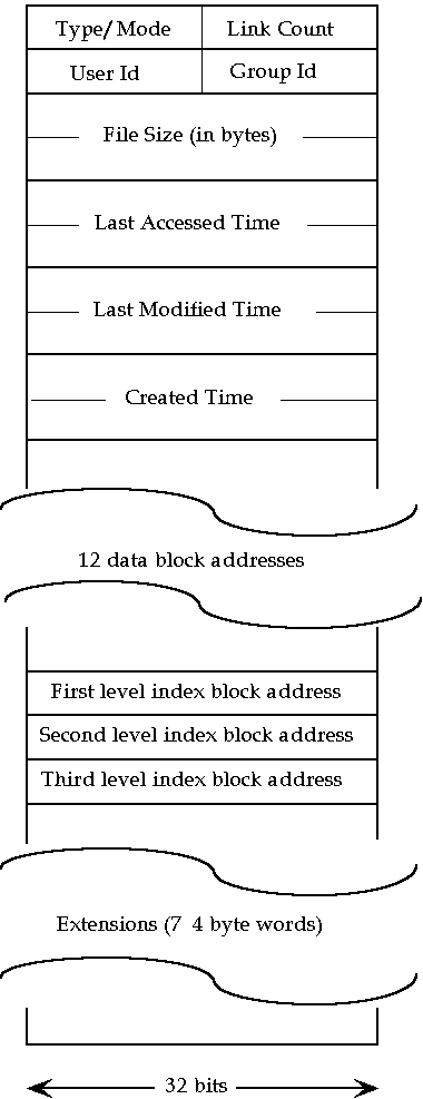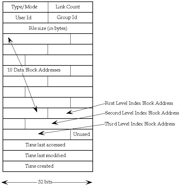 The layout of the components of a System V disc i-node is shown in the following diagram. It occupies 16 32-bit words.