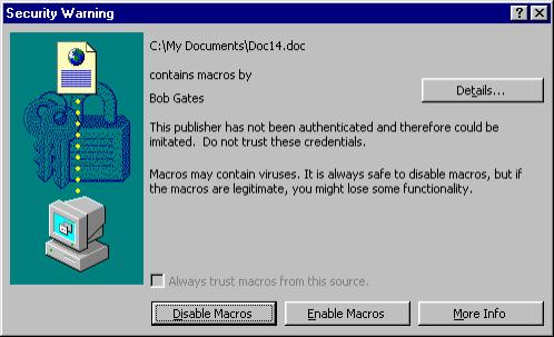 Under high security, Office 2000 silently disables unsigned macros. This helps avoid accidental enabling of potentially dangerous macros when users carelessly dismiss the Security Warning dialog with the Enable Macros button. To help fight the larger number of Word macro viruses spread through documents, Word 2000 is set to high security level by default. Under high security, a security warning is shown for digitally signed macros that have not been previously added to the Trusted Sources list. This allows users the opportunity to inspect the digital certificate, and if they choose to trust all macros from the source, they may then choose to Enable Macros. The Enable Macros button is disabled until the user decides to check the Always trust macros from this source checkbox.