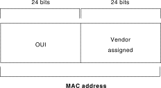 MAC addresses are 48 bits in length and are expressed as 12 hexadecimal digits. The first 6 hexadecimal digits, which are administered by the IEEE, identify the manufacturer or vendor and thus comprise the Organizationally Unique Identifier (OUI). The last 6 hexadecimal digits comprise the interface serial number, or another value administered by the specific vendor. MAC addresses sometimes are called burned-in addresses (BIAs) because they are burned into read-only memory (ROM) and are copied into random-access memory (RAM) when the interface card initializes. Figure 1-15 illustrates the MAC address format.