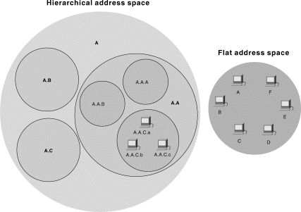 Hierarchical addressing offers certain advantages over flat-addressing schemes. Address sorting and recall is simplified using comparison operations. For example, "Ireland" in a street address eliminates any other country as a possible location. Figure 1-17 illustrates the difference between hierarchical and flat address spaces.