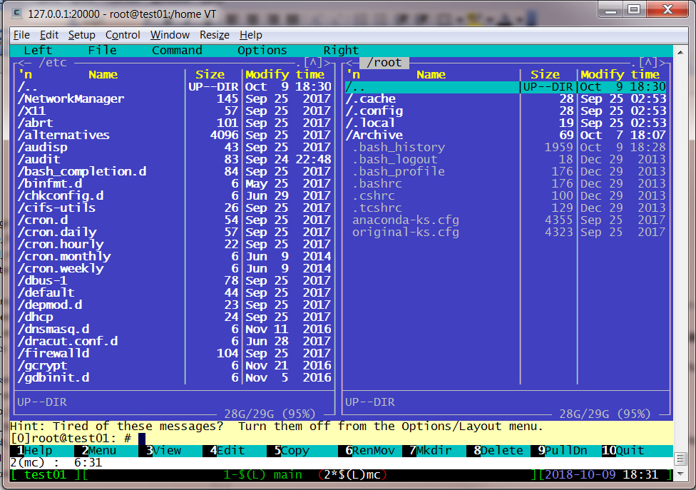 If Midnight Commander started as mc it presents to the user idiosyncratic two panel screen, which is the hallmark of this type of file managers. Tqo directories displayed can be changed and them remembered for the next invocation. For example (here mc is running in one of screen sessions) :
